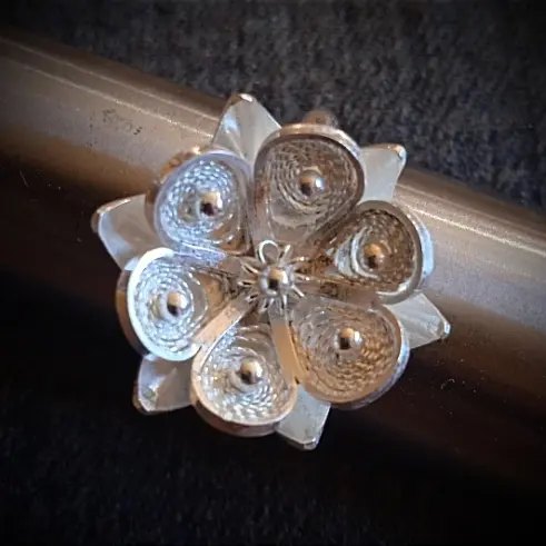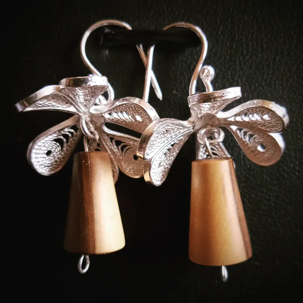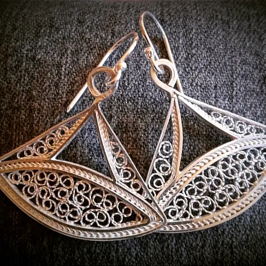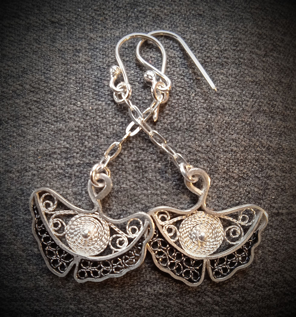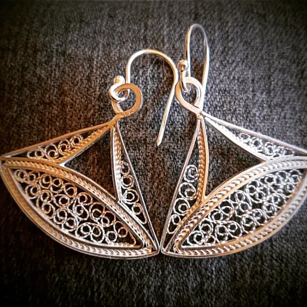 Pendentif double en filigrane d'argent ( argent fin et 925 ) entièrement fait main. Pierres serties: citrine pour l'étoile et agate mousse pour le losange.